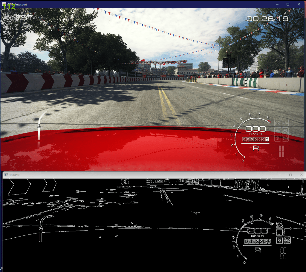 To perform this task I used python to capture the game window and then implement different image processing techniques on select regions of interest. To drive the car I used a virtual keyboard to send velocity and steering commands depending on the minimap in the game. One of the main issues of using the minimap is the transparency in GRID Autosport. I also used a canny edge detector to see if I could identify the available driving region in a scene. The resulting image looked like this:
