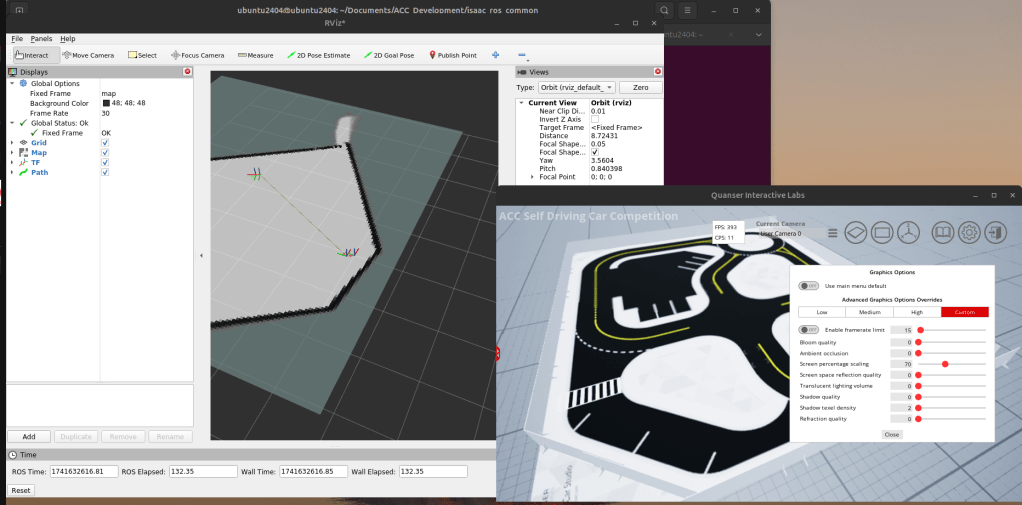 Quanser has a high fidelity simulation for validating and testing self-driving algorithms. Using this as a starting point I began using ROS 2 Humble to create the first iteration of this self-driving stack. ROS 2 utilizes the cartography package to generate occupancy grids of the world and estimate the approximate location of an agent in space. Using this as a starting basis we develop one component of a self-driving vehicle, the localization suite. The intermediate result shows a simulation window like this: